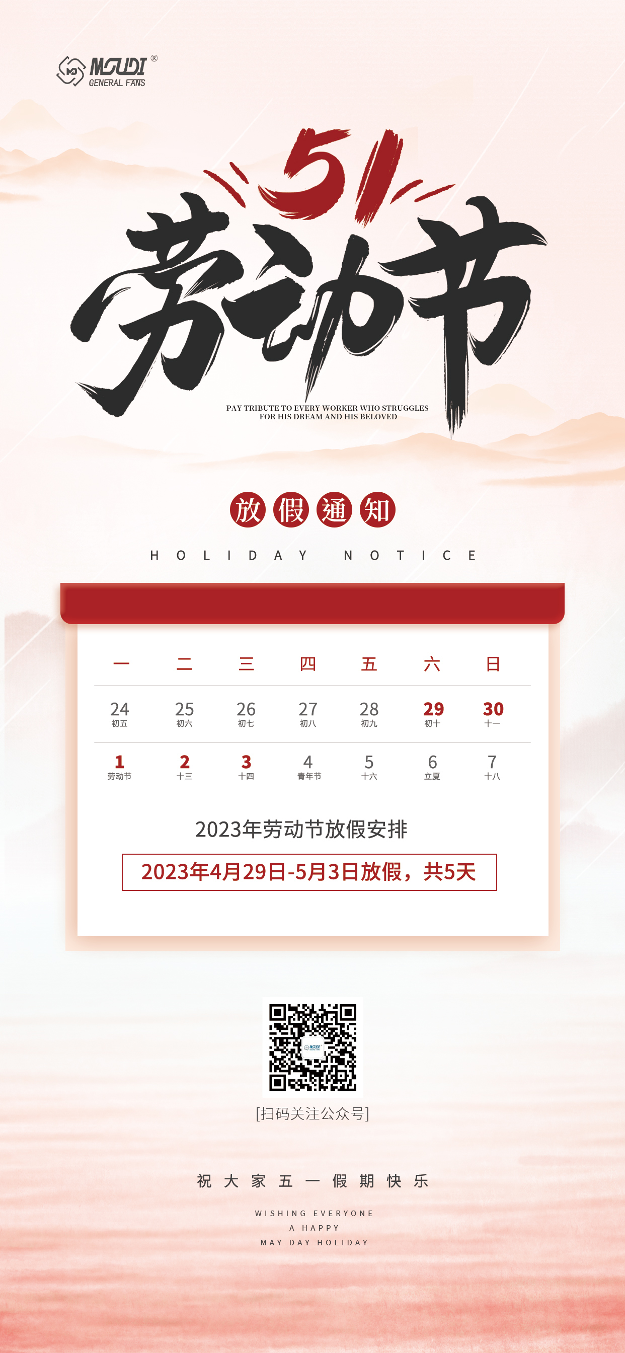 在五一国际劳动节来临之际,牟迪公司全体领导和员工向你表示诚挚的问候,并通过您向你们的家人表示节日的问候和衷心的祝福!